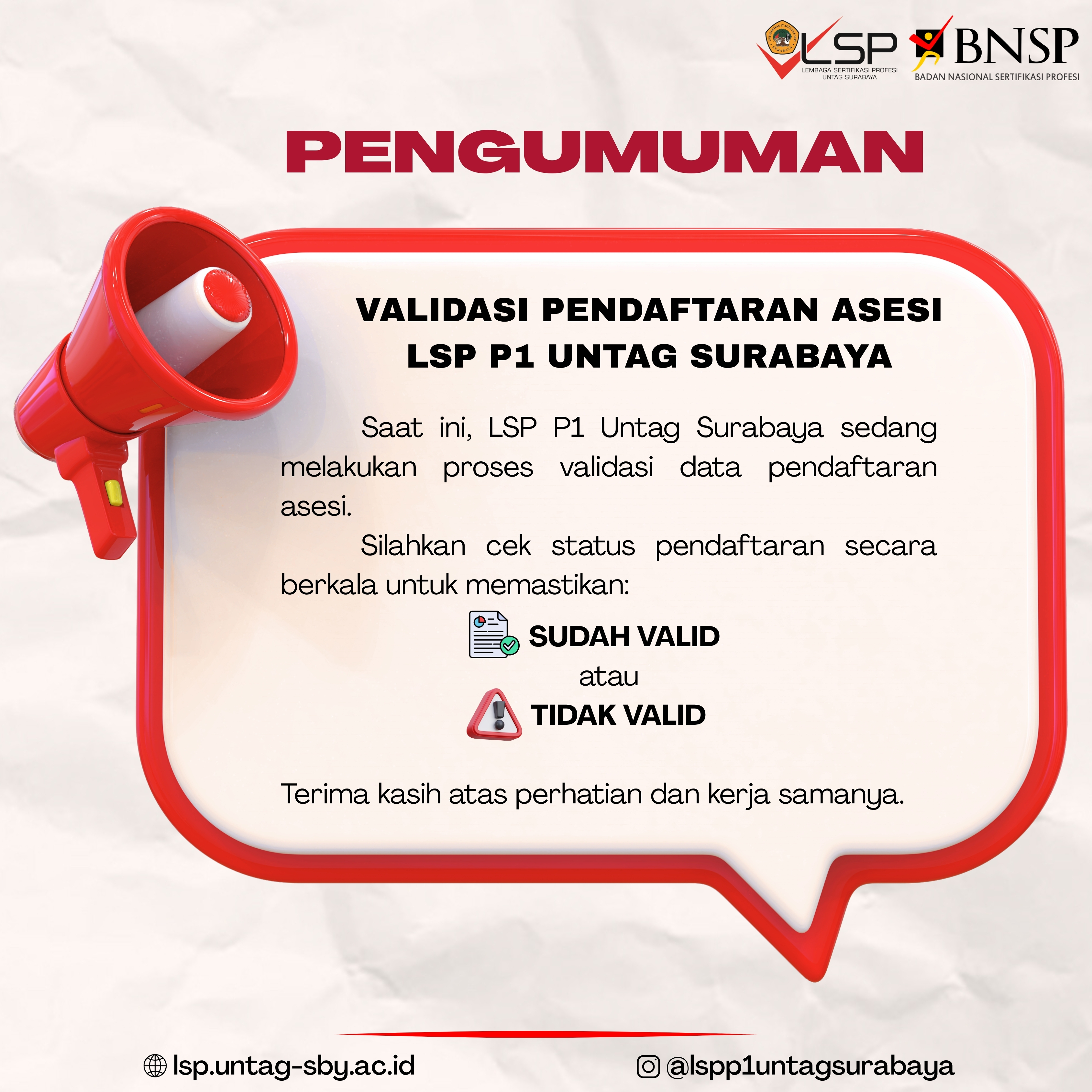 Lembaga Sertifikasi Profesi (LSP) P1 Untag adalah lembaga pelaksanaan kegiatan sertifikasi profesi yang memperoleh lisensi dari Badan Nasional Sertifikasi Profesi (BNSP). Didirikan pada tahun 2016 lembaga ini memiliki 3 skema dan 72 Asesor. Pada tahun 2017 dilakukan penambahan 19 skema sehingga menjadi 22 skema. Di Tahun 2017 menerima ...