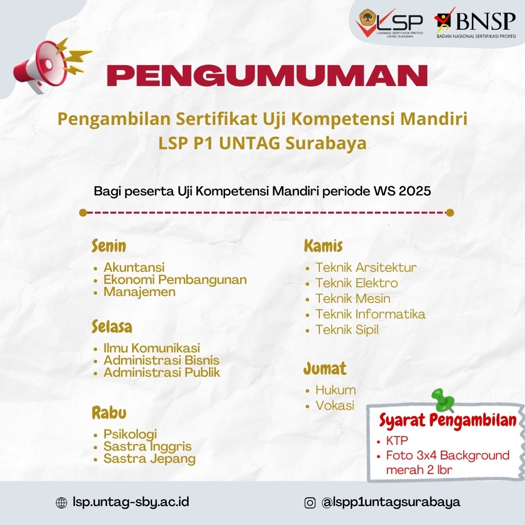 LSP P1 Untag Surabaya Buka Pengambilan Sertifikat Uji Kompetensi Periode WS 25